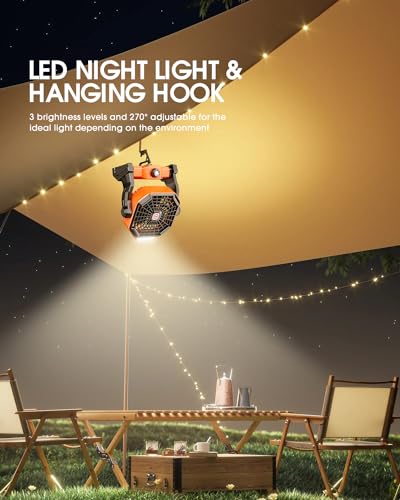 Drchop 10400mAh Solar Fan, Camping Fan with Solar Panel, 7W 9-Inch Rechargeable Battery Operated Fan for Outside, LED Lantern, Stepless Speed and Quiet Battery Powered Solar Tent Fan for Tent,Outdoor, Office, Orange