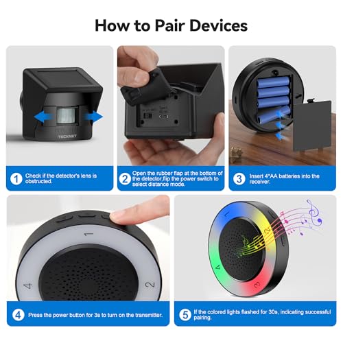 TECKNET Solar Wireless Driveway Alarm with 2600FT Long Range & 36 Melodies & 5 Volumes and Supports 4 Zones Weatherproof Motion Sensor Alarm to Protect Inside /Outside Property (1 Receiver 2 Sensor), Black Item Sku: